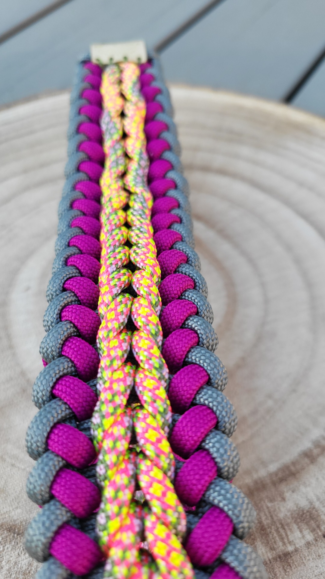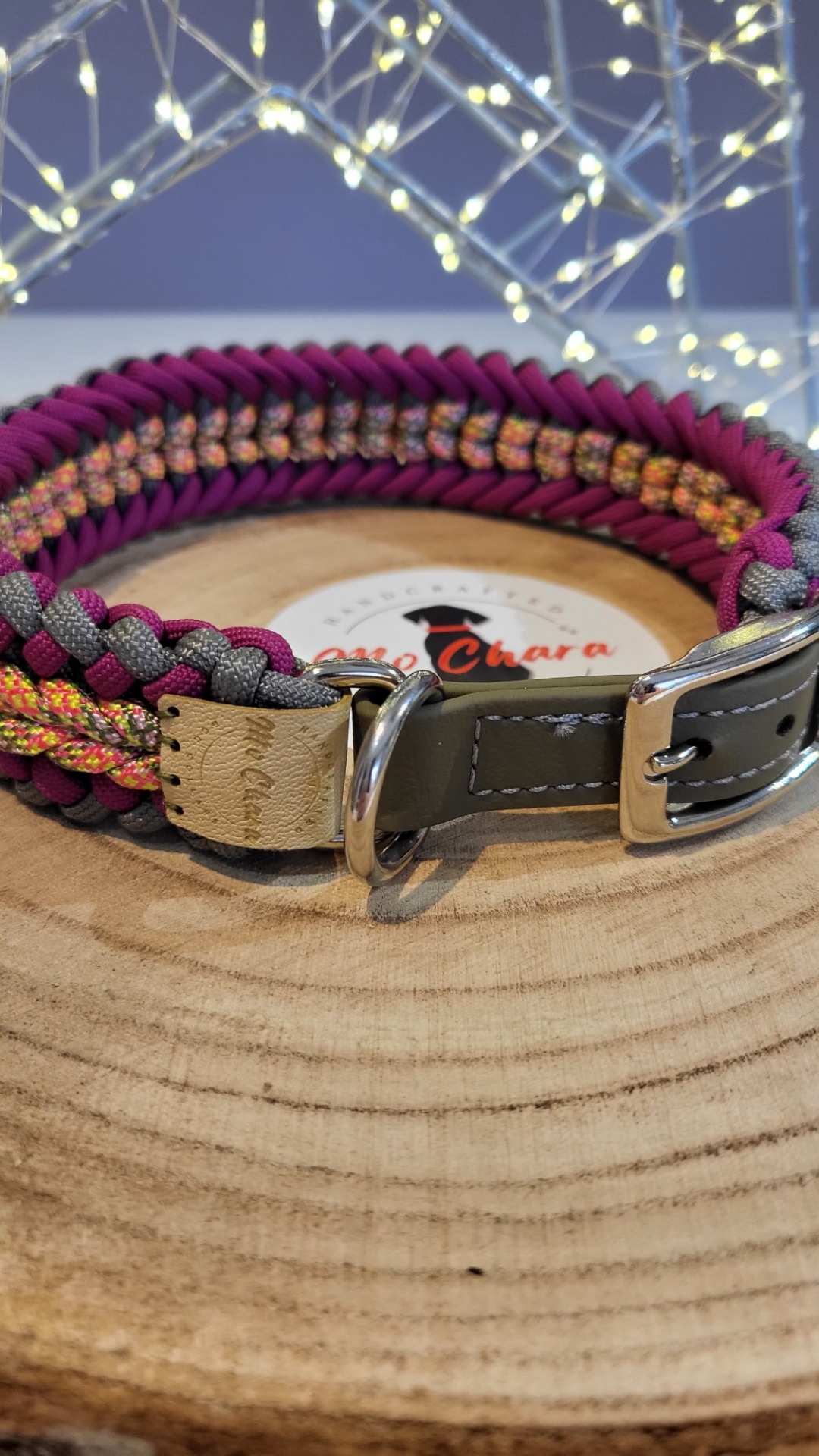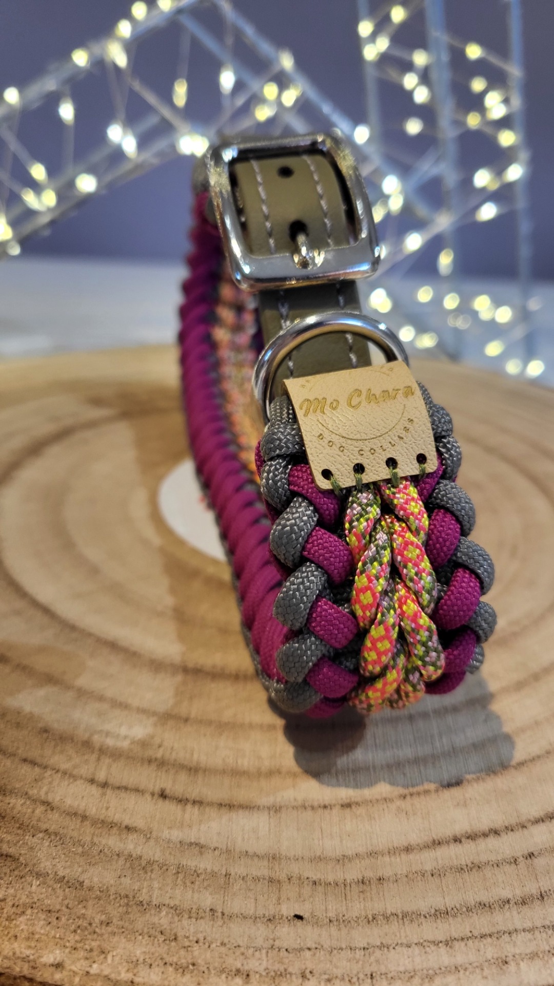 This particular collar is grey, purple with a grey, purple and yellow mix centre.
