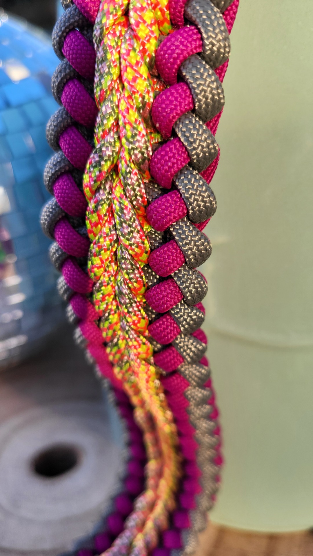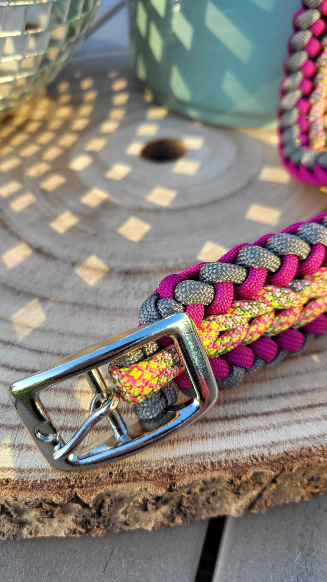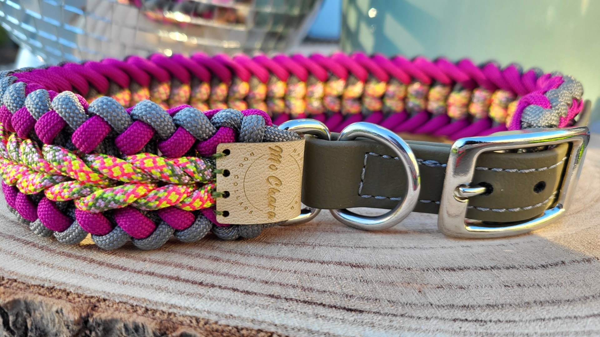 This particular collar is grey, purple with a grey, purple and yellow mix centre.